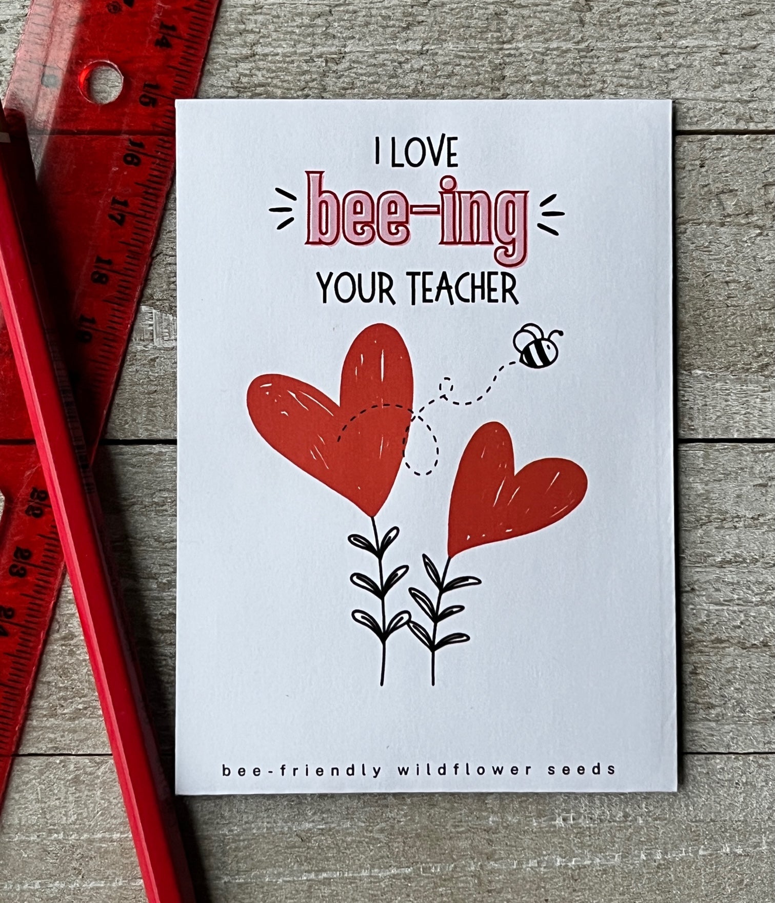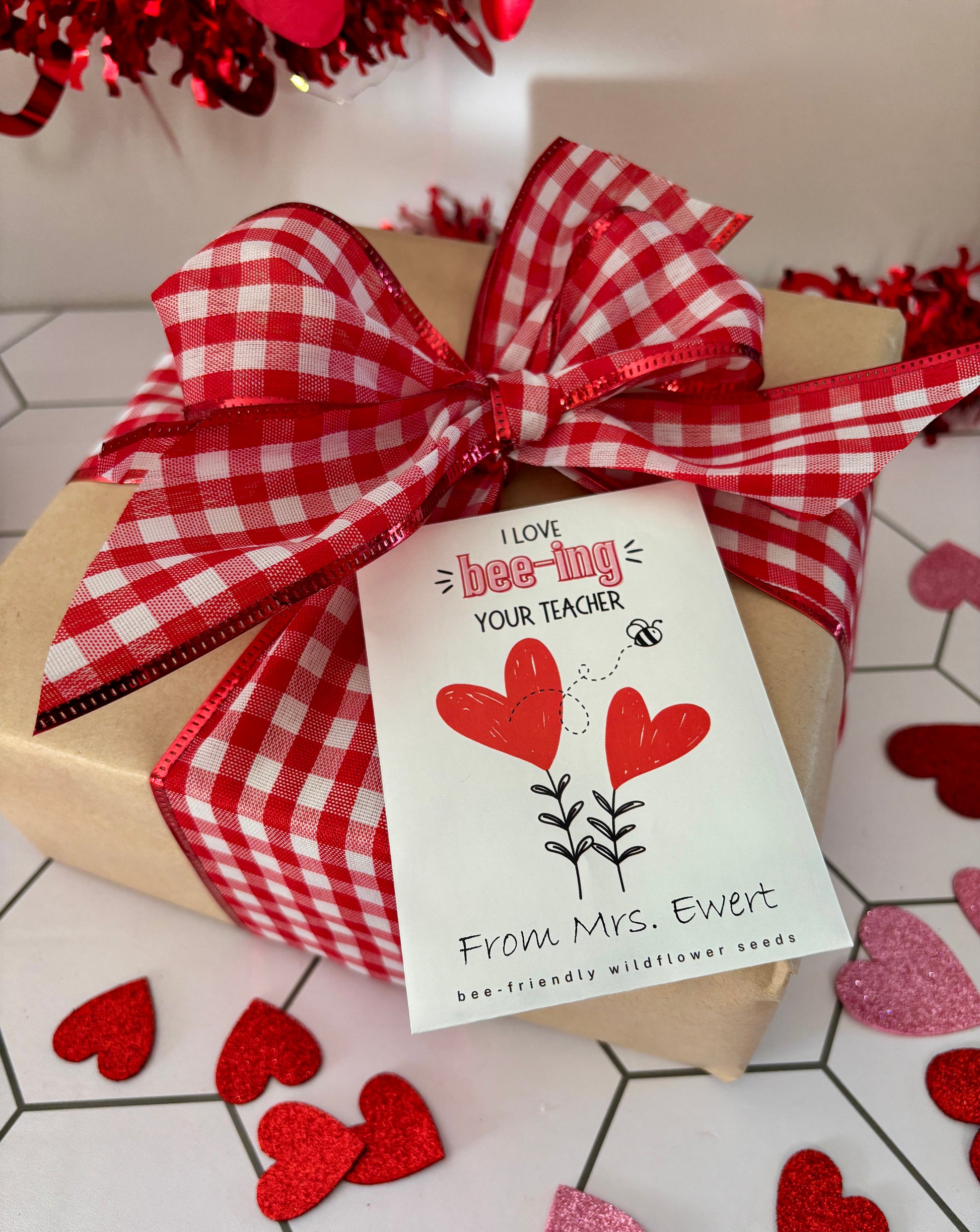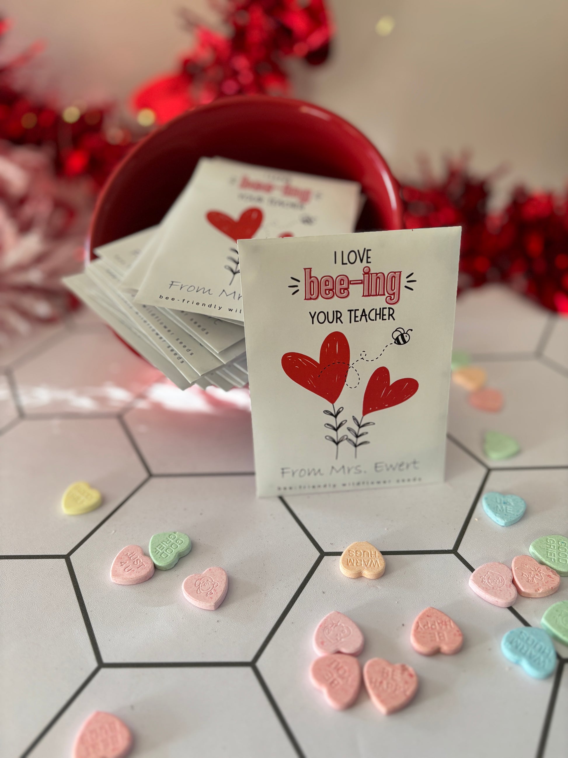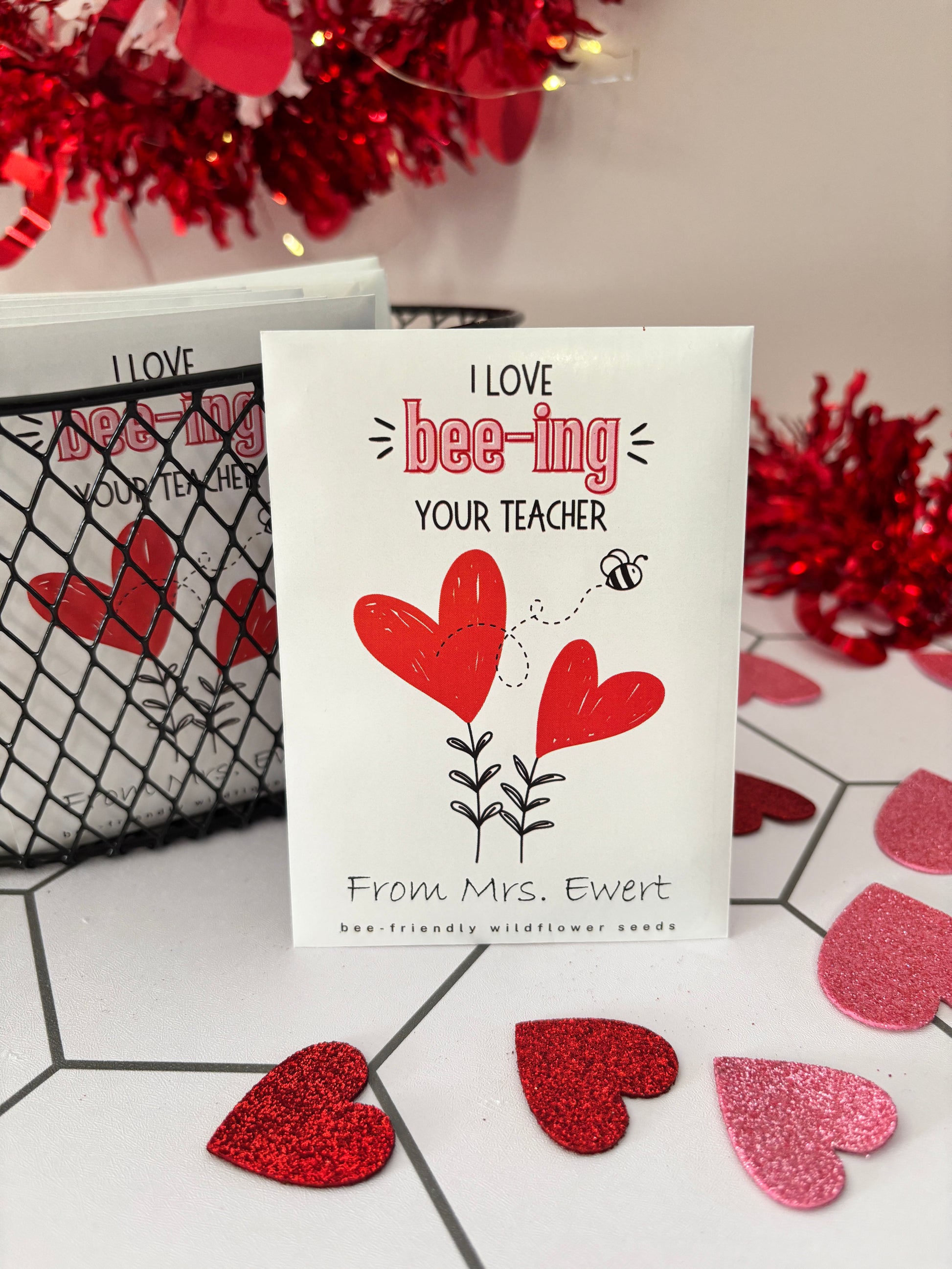 Class is in sesssion! Teachers, are you looking for a meaningful Valentine for your students? Personalized wildflower seed packets make a great Valentine, espeically for students who have been learning about the ecosystem, pollinators and sustainability in class. Each packet comes with a mix containing 12 varieties of bee-friendly wildflowers. Students will love seeing their flowers bloom and helping the bees!