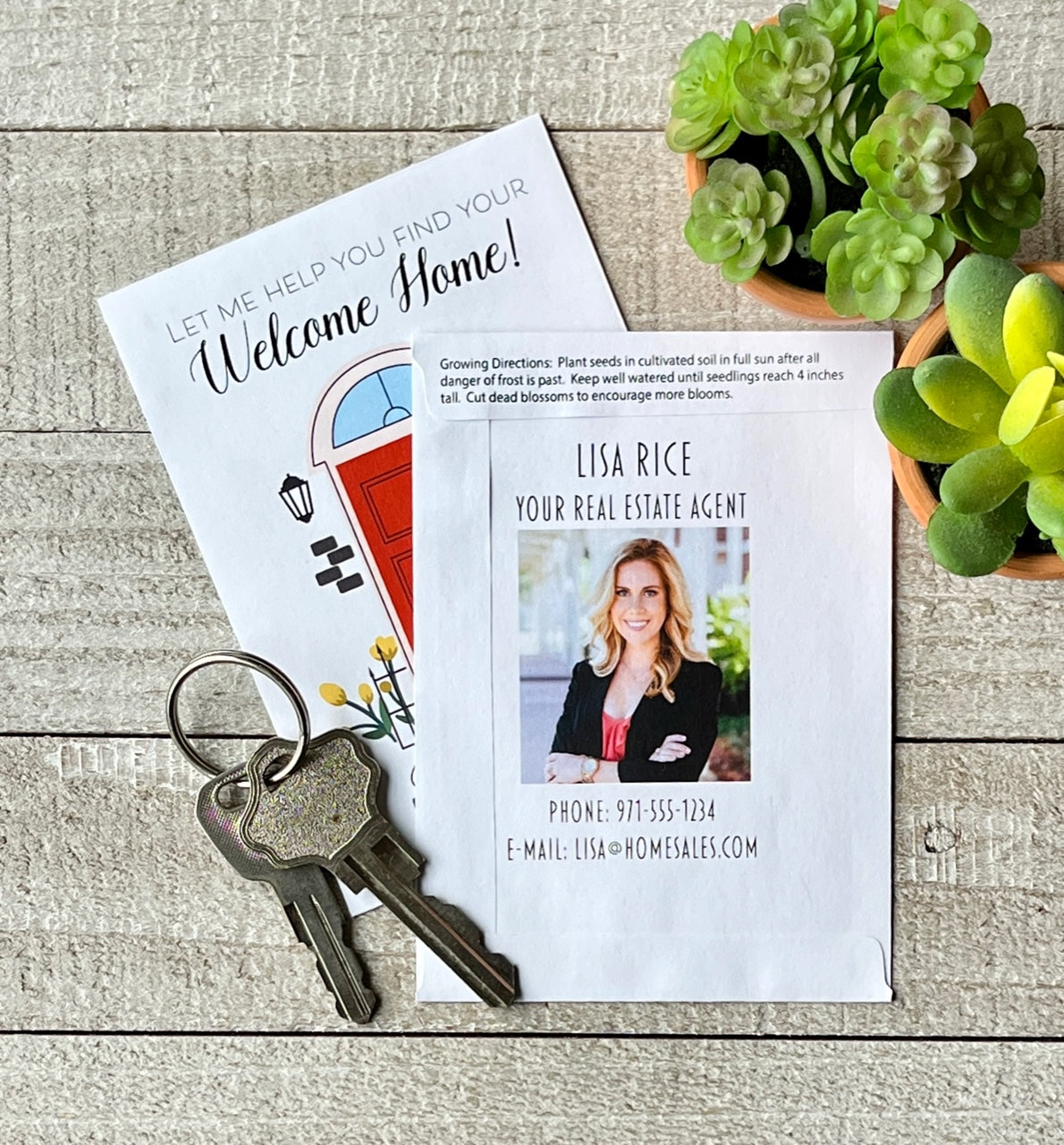 Not only do our seed packets make a beautiful gift for new homebuyers, but they also serve as a sustainable and earth-friendly calling card for prospective clients. Made with eco-friendly and sustainably sourced materials, our packets are not only beautiful, but also help to promote environmental consciousness.