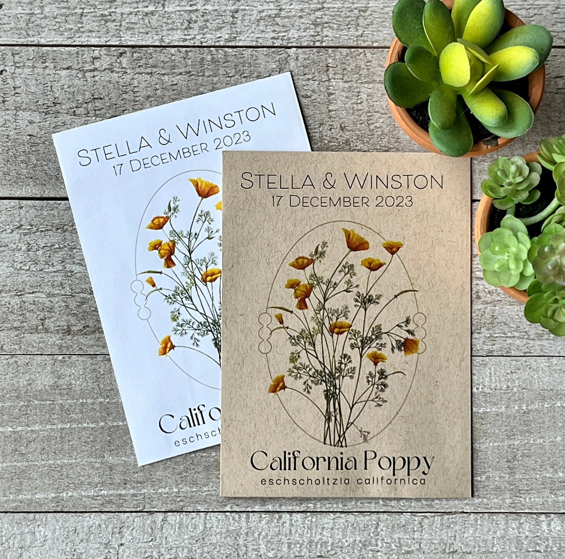Say goodbye to generic and forgettable event favors! Say hello to our beautiful and customizable California Poppy seed packets. Each packet comes filled with approximately 60 seeds of the iconic California Poppy, symbolizing hope and renewal. Whether it's a funeral, wedding or promotional event, these seed packets will leave a lasting impact on your guests and clients. The vibrant and eye-catching packets can be personalized with your special message or company logo, adding a personal touch to your event. Not only will these favors bring a pop of color to your guests' gardens, but they will also bring a smile to their faces each time they see the beautiful poppies in bloom. Celebrate your special occasion with a touch of nature and show your guests that you truly care about making a positive impact on the world.
