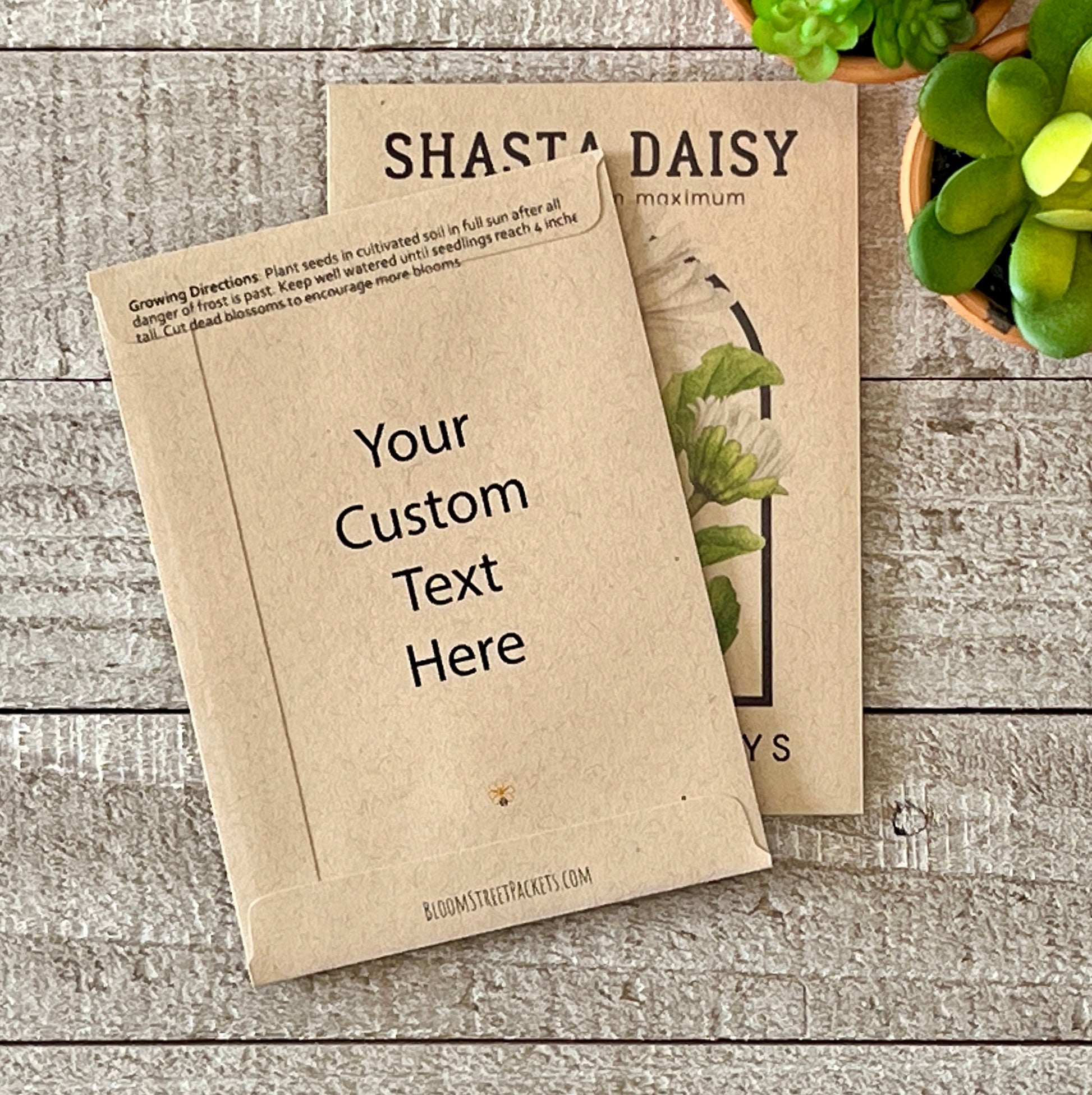 Celebrate your special event or spread your message in an eco-friendly and unique way with our customizable seed packet favors. These packets are the perfect choice for weddings, showers, birthday parties, block parties, Earth Day events, or any time you need a personalized, earth-friendly favor to hand out. They're also ideal as a promotional item for real estate agents or other businesses who want to show their commitment to sustainability.