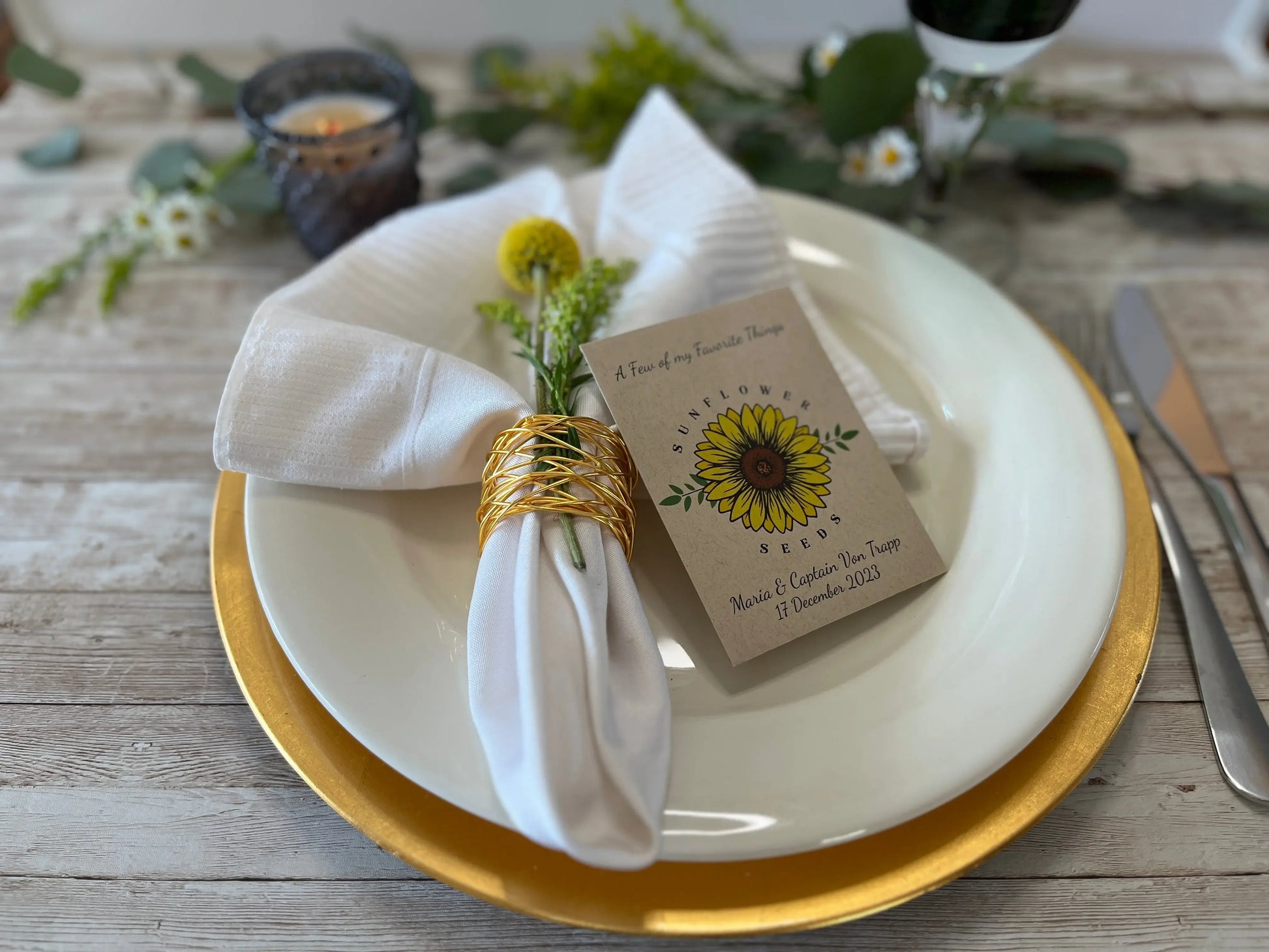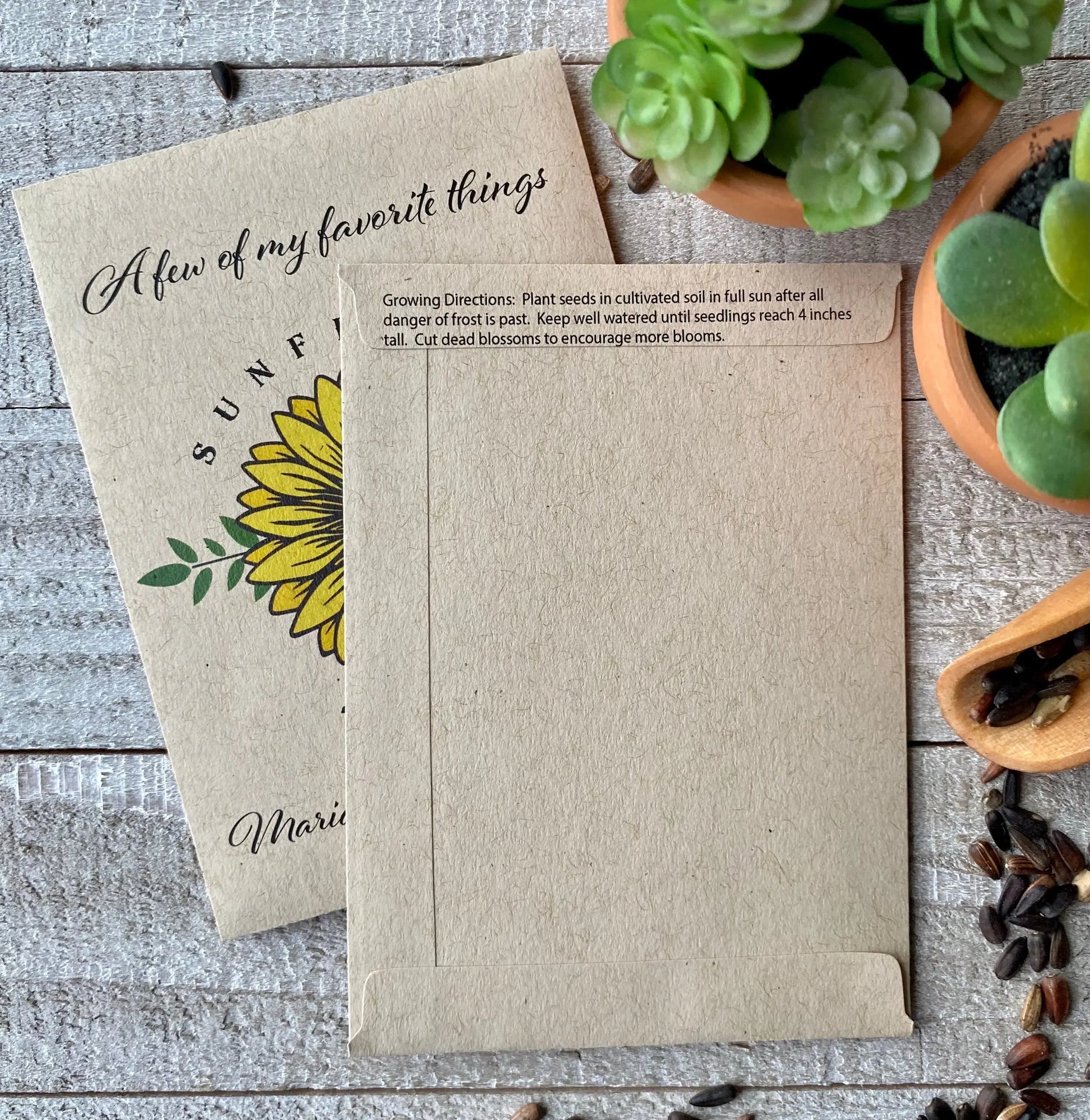 This simple sunflower design leaves plenty of room for personalization on the top and bottom of this seed packet, as well as on the back if desired. Order in bulk to save money per packet, or order as few as fifty packets, still priced competitively. Our packets are made with sustainable practices, using recycled materials and our seed is non-gmo, open pollinated, and bee friendly. Personalize with your information on the front, or front and back. There's even room on the back for a logo, artwork or your own photo.