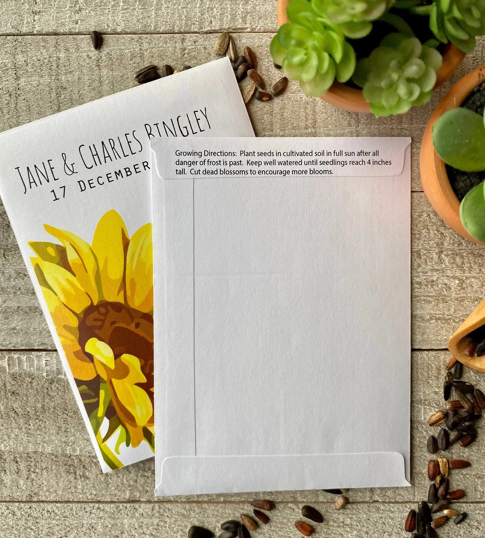 A larger than life sunflower graces the front of this seed packet and makes a bold statement your guests o customers will love. Perfect for wedding favor, bridal shower, birth announcement, celebration of life, memorial, graduation or party gift. Order in bulk for best pricing. Each packet contains non-gmo, open pollinated, bee-friendly seed your guests can plant to remember your event. Seed packets are sustainably produced using green energy and recycled materials.