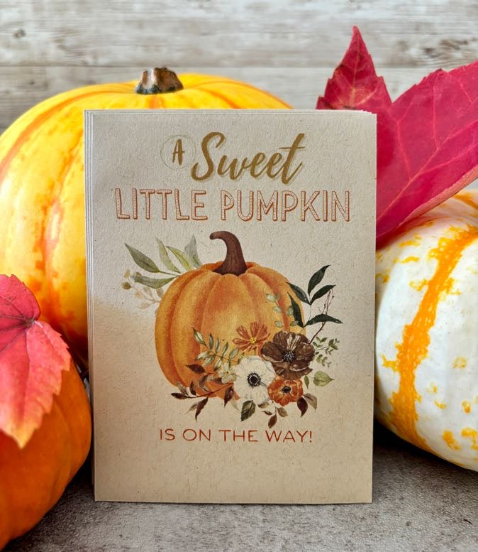 Adorable customizable pumpkin seed packet favors perfect for your Fall baby shower. Customize with your baby's name and due date, or any other information you wish. Each packet comes with 10-15 Little Sugar variety pumpkin seeds, an heirloom pie pumpkin variety, perfect for making soups, pies, or roasting. The packets come in white or Kraft brown, are 3.25” x 4.5” and come shipped to you, seed included, ready to hand out to your guests!