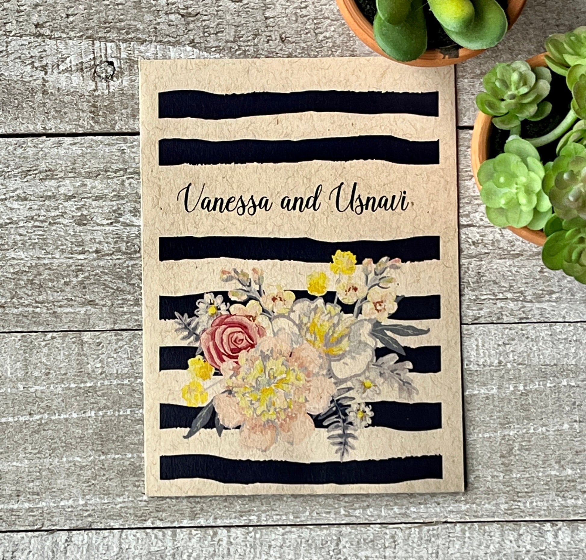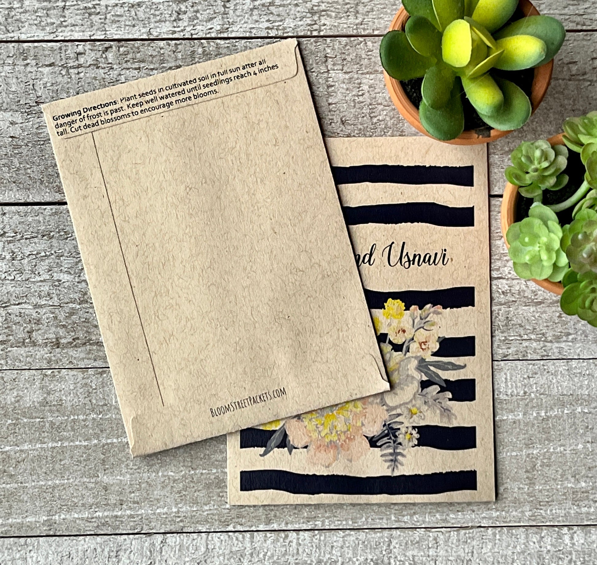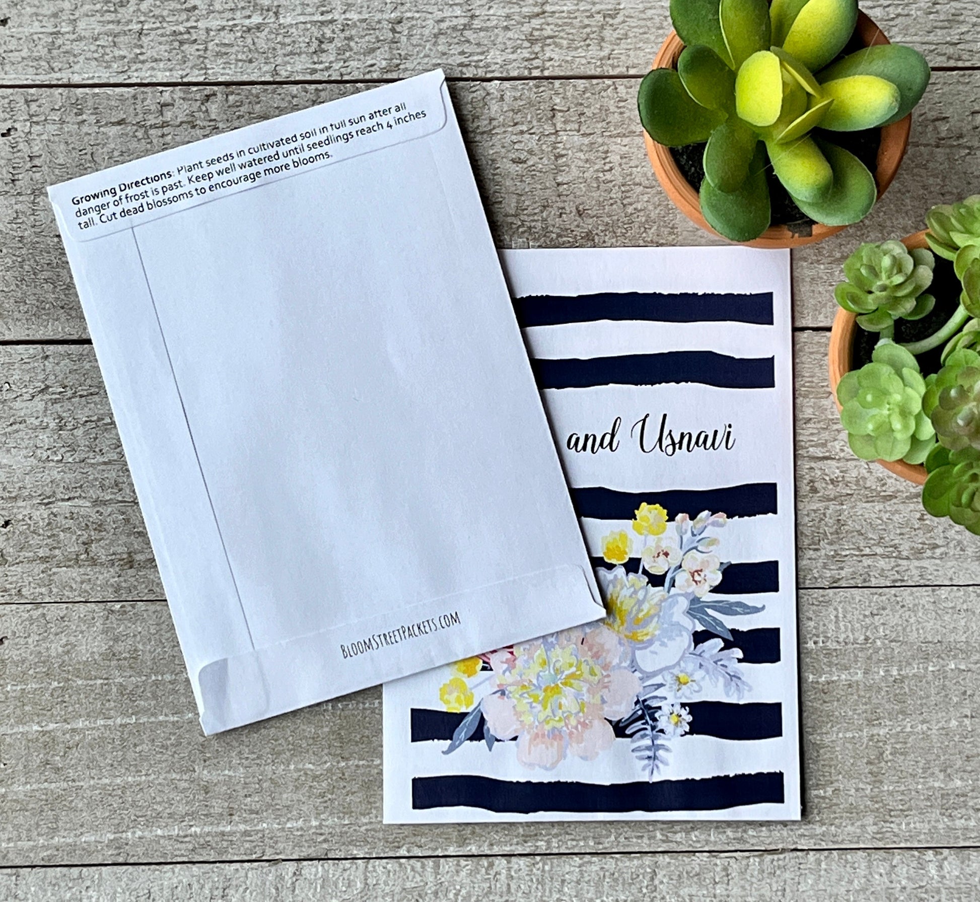 Save the bees when you give this gorgeous, earth-friendly seed packet as a favor or promotional item. Each packet comes with non-gmo, open pollinated wildflower seeds that will turn yards into bee-havens. Perfect for your wedding, bridal shower, or birthday party. Also works well for Earth Day, promotional items, or thank you gifts for customers. Order in bulk for best pricing. Each packet contains about 200-300 non-gmo, open pollinated, bee-friendly wildflower seeds. Our packets are sustainably sourced using green energy and recycled materials.